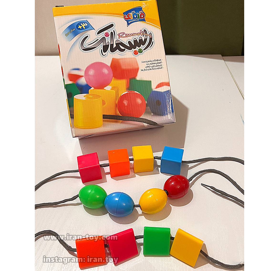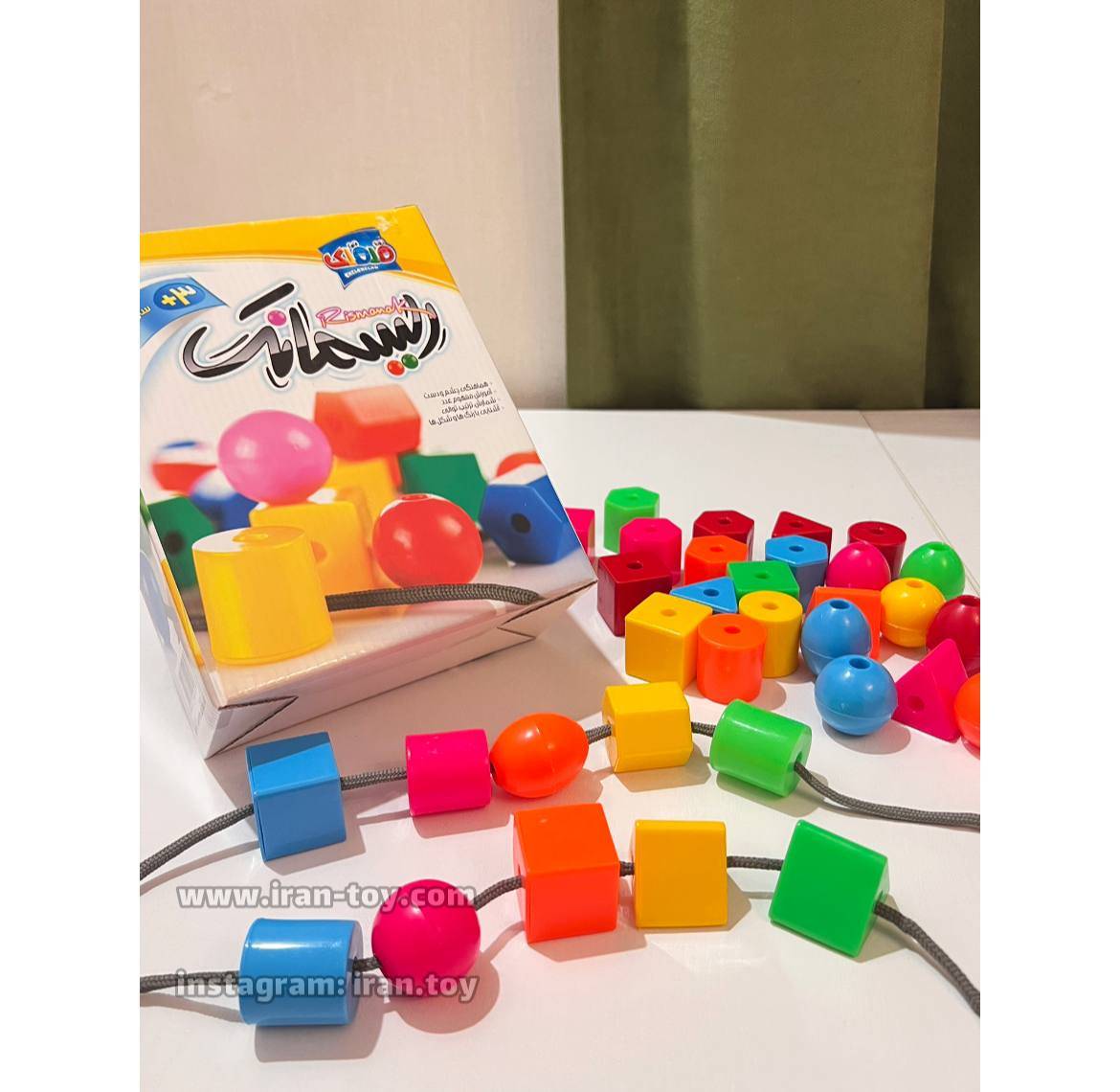 - بازی فکری ریسمانک یک بازی برای تقویت مهارت دستورزی کودکان بالای سه سال است. اندازه ی مناسب شکل ها و سوراخ های شکل ها باعث می شود کودکان بتوانند به راحتی آن ها را نخ و الگوهای متنوعی خلق کنند. که به کودک در شناخت رنگ ها، آموزش شمارش و طبقه بندی شکل ها کمک می کند.