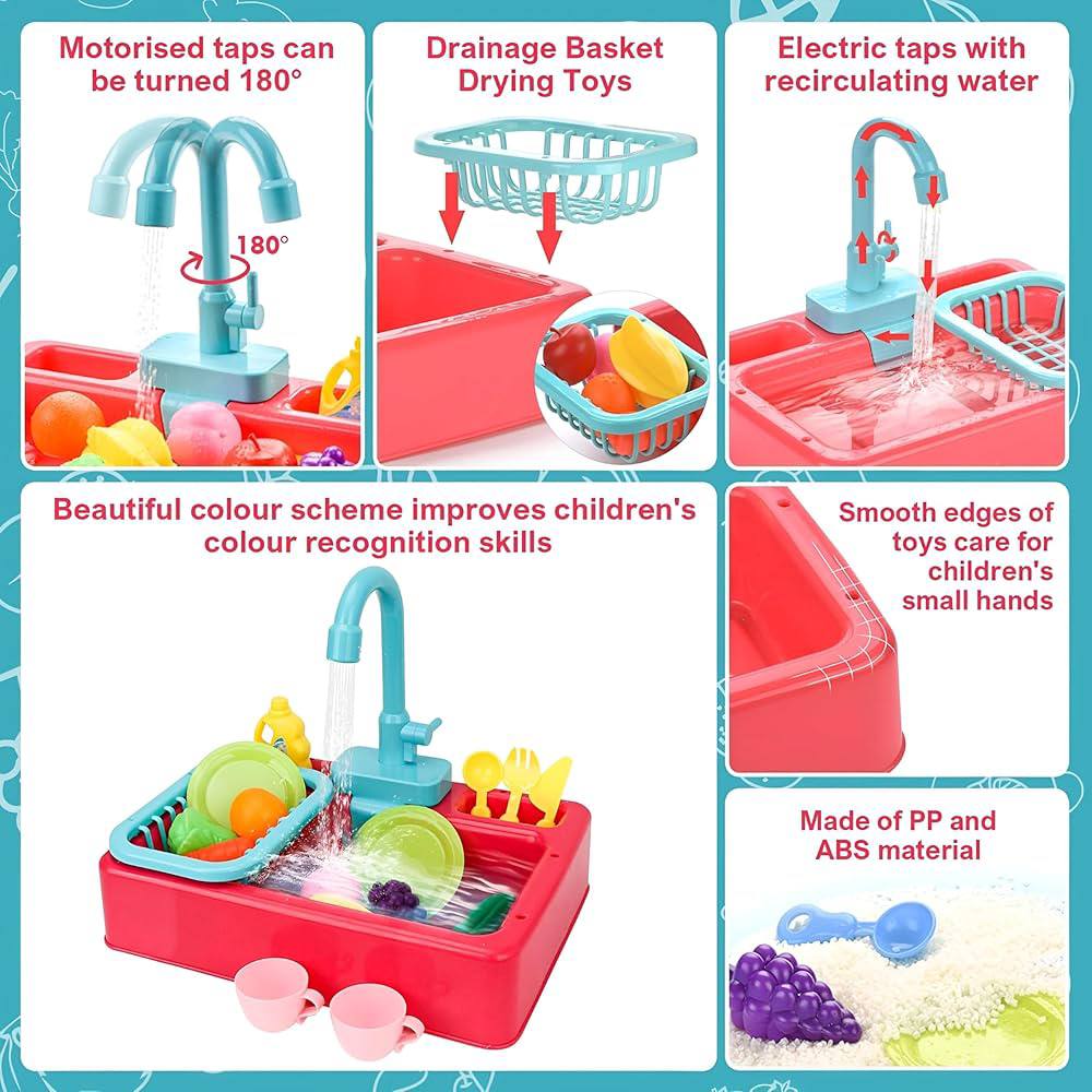 • قابلیت کارکرد واقعی شیر آب با استفاده از باتری قلمی، حس شستن ظروف واقعی را برای کودک شبیه‌سازی می‌کند و بازی را هیجان‌انگیزتر می‌سازد. این سینک ظرفشویی مستطیل صورتی علاوه بر سرگرمی، نقش مؤثری در تقویت مهارت‌های اجتماعی، هماهنگی حرکتی دست و چشم، نظم‌پذیری و مسئولیت‌پذیری کودک دارد.