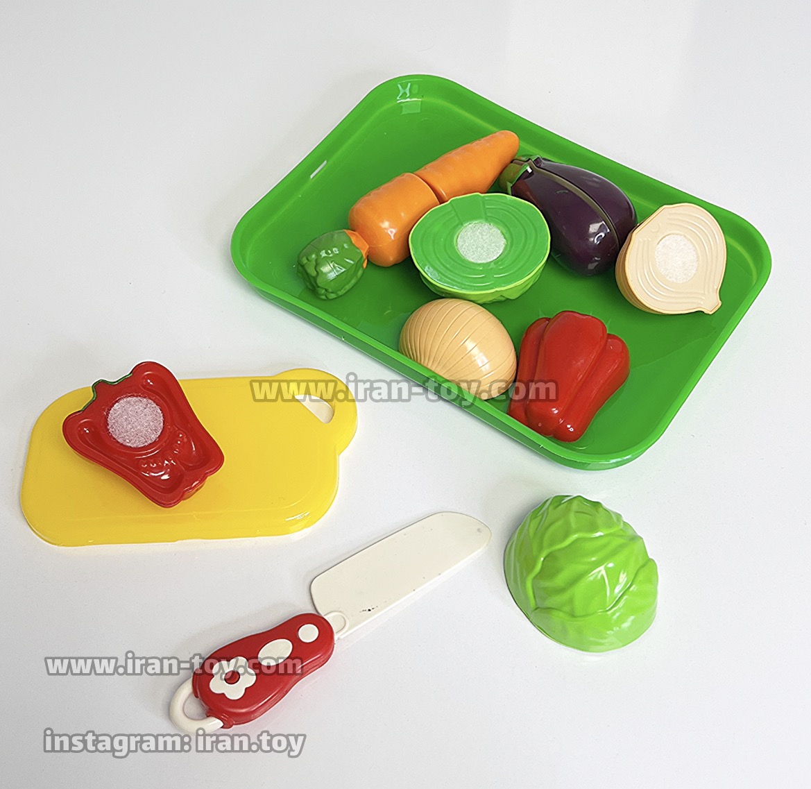 - اسباب بازی میوه برشی با سینی هر میوه از دو بخش تشکیل شده که با نوار چسبدار به هم متصل میشوند و کودک میتواند با چاقوی ایمن مخصوص، آنها را “برش” بزند و دوباره سرهم کند و کودکان میتوانند حس آشپزی واقعی و بازی خلاقانه را تجربه کنند و این بازی بسیار ایمن است .