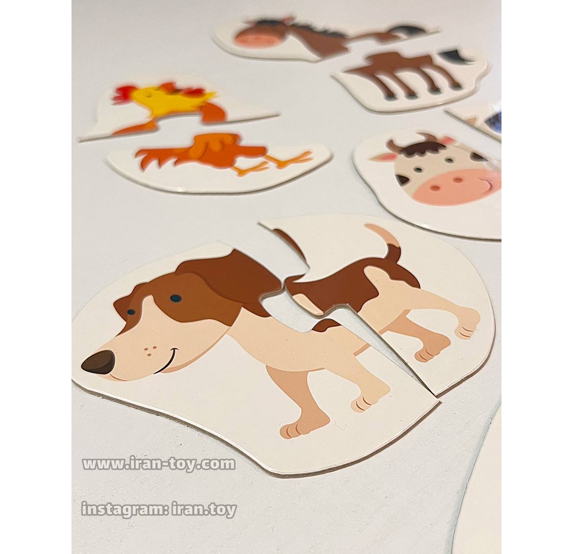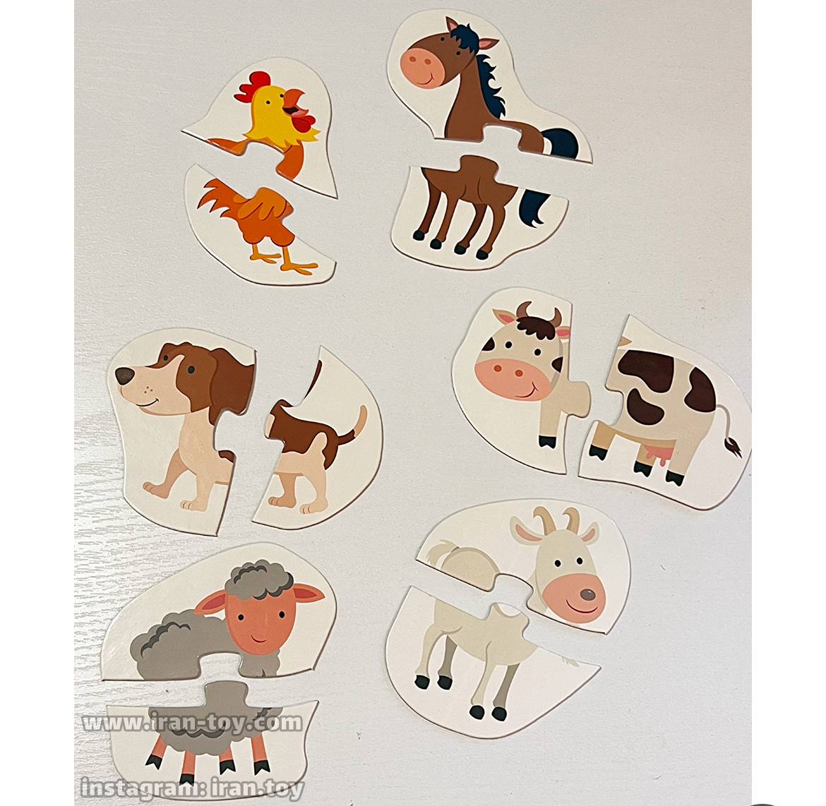- داخل جعبه این بازی 6 عدد پازل دو تکه حیوانات مزرعه وجود دارد. قطعات این پازل درشت هستند و کودک به راحتی می تواند آن ها را بچیند.